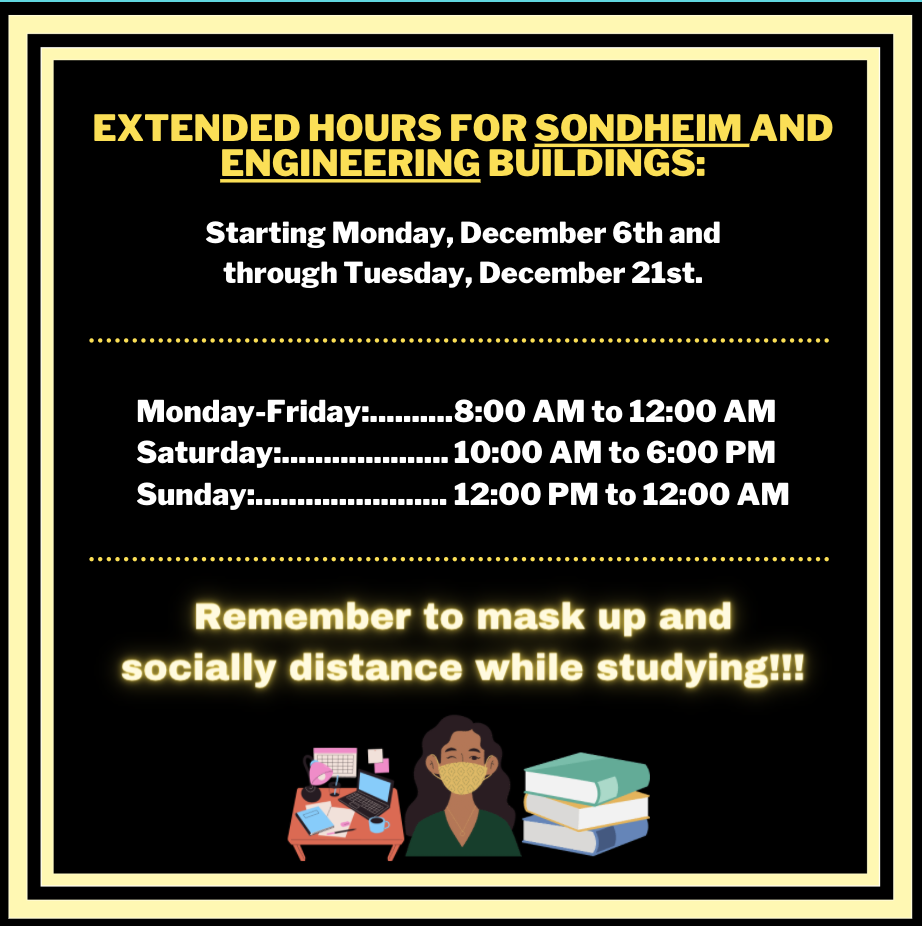SGA, in partnership with the Provost’s Office, has been working hard to identify study spaces on campus for students. Above are additional hours the Sondheim and Engineering buildings will be available to students where designated study space has been set up!