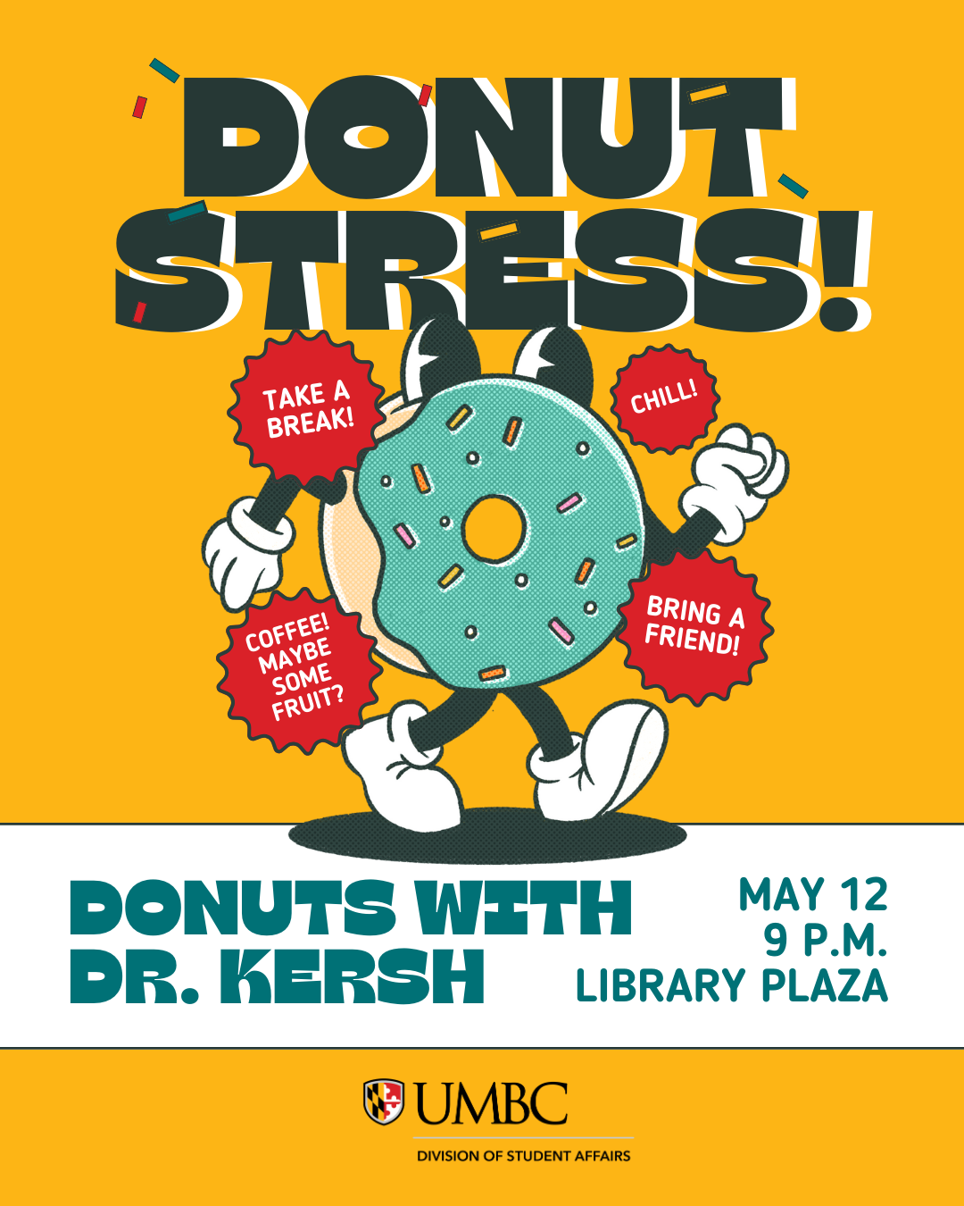 Donuts with Dr. Kersh. Donut stress. Take a break! Donuts with Dr. Kersh. Chill. Grab a snack. Bring a friend. May 12 at 9 p.m., UMBC Library Plaza Attached Flyer for Donut stress. Take a break! Attached Image for Donut stress. Take a break! Posted: May 6, 2025, 8:11 AM