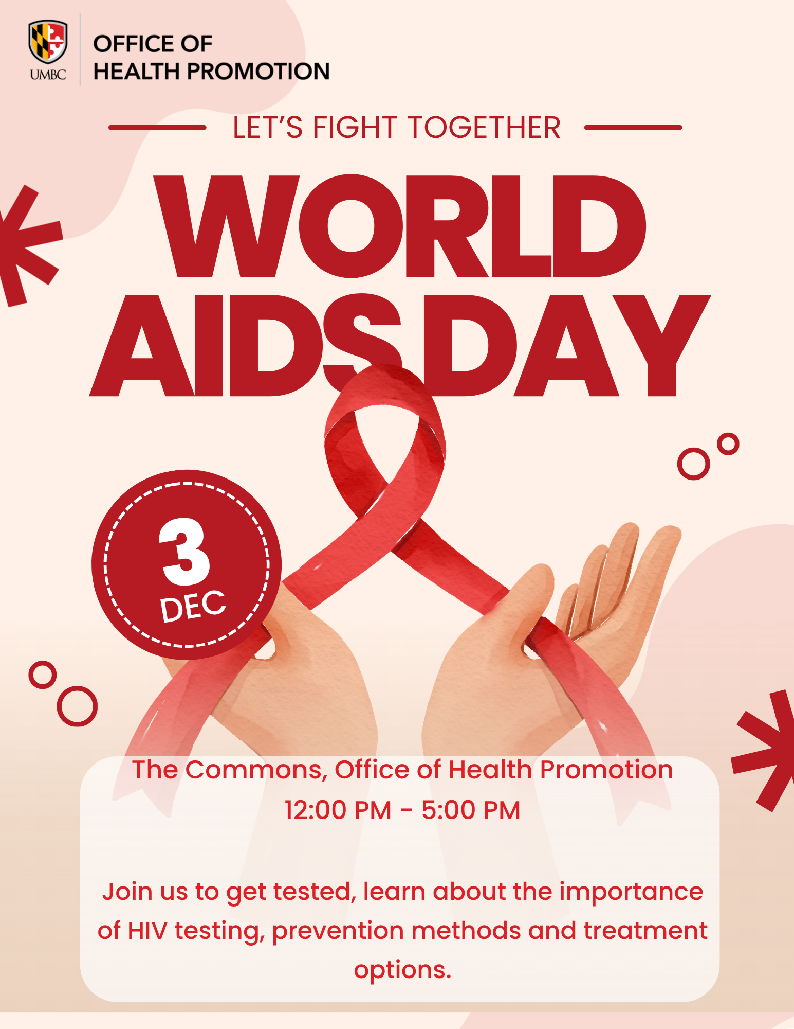 OHP will be partnering with the Baltimore County Health Department for World Aids Day to provide free, anonymous, and rapid HIV and STI testing to students, staff, and faculty. This event will be held on Wednesday, December 3rd, from 12-5 pm in OHP's office space (next to the bookstore).
